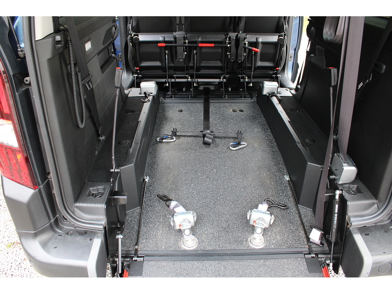 5 travel seats plus wheelchair or mobility scooter, with securring lap and diagonal seat belt for the chair users saftey and comfort.