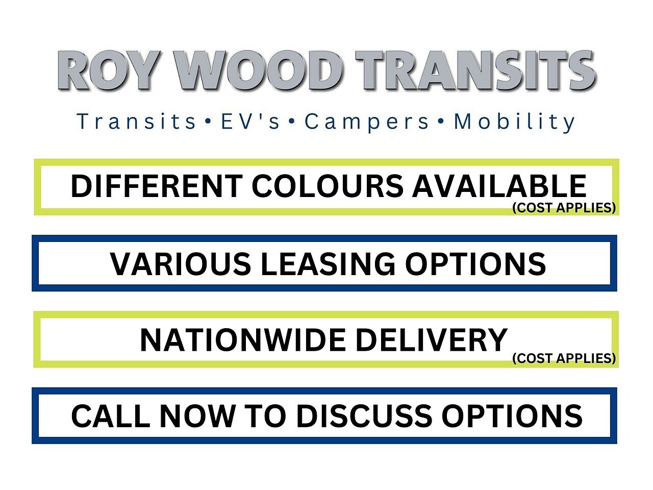Roy Wood Transits are an Independent Transit Specialist established in 1970, with 55 years heritage including previous accreditation with Motability and wheelchair accessible vehicles.